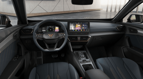 Pri otvorení dverí sa rozsvieti unikátne uvítacie osvetlenie, ktoré zvýrazní kožený športový volant a škrupinové sedadlá. Kokpit doslova obopína vodiča a spolujazdca vpredu, horizontálne členený prístrojový panel plynulo prechádza do výplní predných dverí. Prvky z tmavého chrómu a lesklé čierne akcenty dodávajú kabíne vzhľad premium. Karbónové operadlá škrupinových sedadiel symbolizujú ľahkosť a športový charakter. Vodič štúdie CUPRA Formentor sedí nižšie, v ergonomickejšej polohe.
